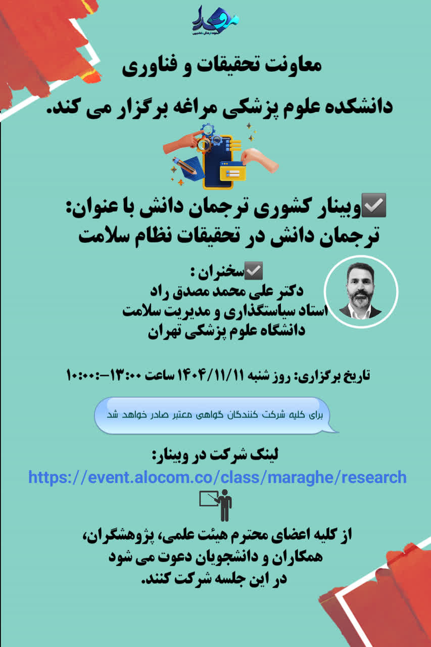 معاونت تحقیقات و فناوری دانشکده علوم پزشکی مراغه برگزار می کند. وبینار کشوری ترجمان دانش با عنوان: ترجمان دانش در تحقیقات نظام سلامت سخنران : دکتر علی محمد مصدق راد استاد سیاستگذاری و مدیریت سلامت دانشگاه علوم پزشکی تهران تاریخ برگزاری روز شنبه ۱۴۰۴/۱۱/۱۱ ساعت ۱۳:۰۰-:۱۰:۰۰